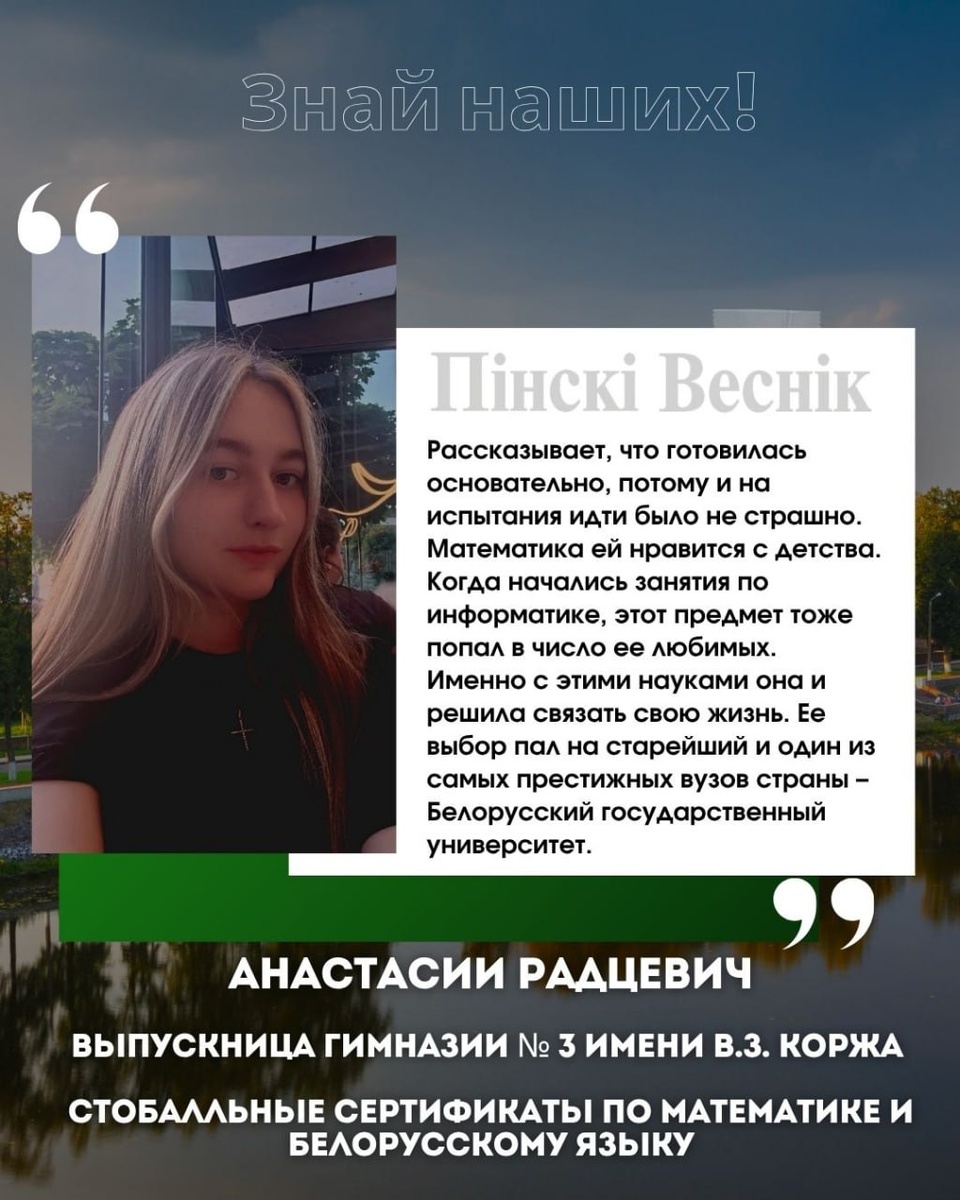 📌У выпускницы гимназии № 3 имени В.З. Коржа Анастасии Радцевич стобалльные сертификаты по математике и белорусскому языку. ▪️Она рассказывает, что готовилась основательно, потому и на испытания идти было не страшно. Математика ей нравится с детства. Когда начались занятия по информатике, этот предмет тоже попал в число ее любимых. Именно с этими науками она и решила связать свою жизнь. Ее выбор пал на старейший и один из самых престижных вузов страны – Белорусский государственный университет. Мечтает учиться на факультете прикладной математики и информатики, а в будущем работать в сфере IT-технологий, небезосновательно считая ее очень перспективной и востребованной. ▪️Играет в волейбол, занималась этим видом спорта в ДЮСШОР № 2. Очень любит рисовать маслом, особенно удаются портреты, немало у нее и удачных эскизов. 📍📍@Пинский Вестник ЮТУБ | САЙТ| ИНСТ | ВК | ОК | ФЕ | Прислать новость