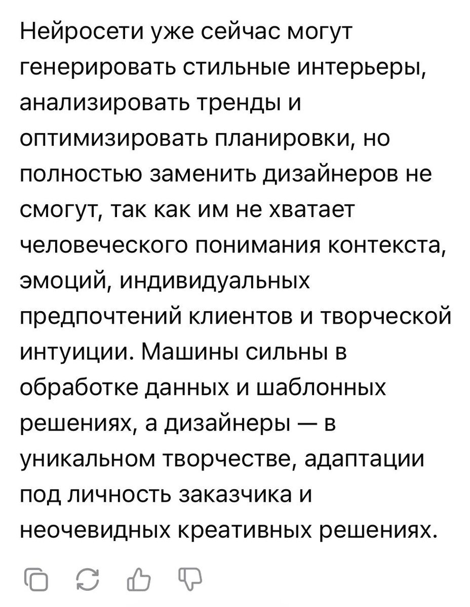 Спросил у нейросети, смогут ли машины заменить дизайнеров интерьера. Пока ответ — нет.