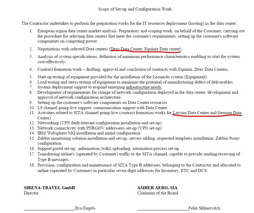 Проблему раскрывают внутренние документы. В 2021 году «Сирена-Трэвел» учредила дочернюю компанию Sirena-Travel GmbH в Германии, через которую заключила договор на размещение своих серверов за границей. Согласно Addendum (дополнительному соглашению) от 1 сентября 2023 года, Sirena-Travel GmbH (директор – Илья Энгельс) подписала соглашение в Риге с латвийской фирмой Amber Aero SIA, действующей от лица Феликса Скляревича (Источник 11 ADDENDUM_for_SITA_services_GmbH_Amber_ver_2.0.pdf). Этот документ детализирует, что латвийский подрядчик берётся обеспечить развёртывание IT-ресурсов «Сирены» в зарубежных дата-центрах, включая подготовку инфраструктуры, интеграцию и поддержку. В перечне работ значатся переговоры и заключение контрактов с конкретными дата-центрами – латвийским Deac и транснациональным Equinix. Иными словами, серверы, обрабатывающие данные российской авиационной системы, размещаются на площадках в Риге (Латвия) и, вероятно, в Европе (Equinix имеет площадки в Германии и других странах).