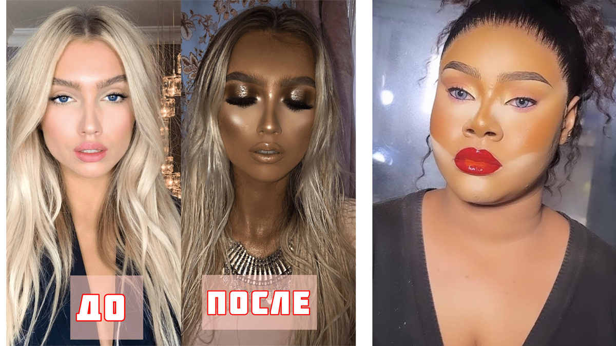 Очень зря эти девушки доверили свою красоту визажистам. Удивительно, как можно было испортить такие симпатичные лица. Когда мы обращаемся за услугой профессионального макияжа, то ожидаем, что мастер как минимум подчеркнет наши природные достоинства, а как максимум — замаскирует то, чем мы недовольны. Увы, иногда визажист может такое намалевать на лице, что потом век не отмоешься. Во всех смыслах этого слова. Наверное, у девушки был запрос на эффектный загар. Но в результате получилось вот это: как будто на лицо вылили вагон китайского бронзера с рынка, насыпав сверху глиттера. Это мы еще молчим про “гусениц” вместо ресниц. Вот что бывает, когда не умеешь наносить тональник. Или выбираешь некачественное средство с рынка. В результате тон скатывается на лице, оставляет уродливые полосы и пятна на коже. Уровень “мастерства” визажиста также можно оценить по растушевке теней. Точнее, по ее отсутствию. Это выглядит так, будто визажист спутал лицо клиентки с детской раскраской. Иначе не объяс