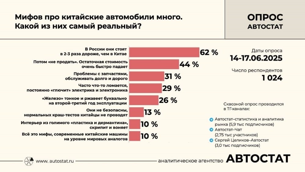 Глава агентства "Автостат" Сергей Целиков разобрал главные российские мифы о китайских автомобилях. Сначала эксперт провел в трех подведомственных ему телеграм-каналах опрос на тему, какой из мифов наиболее реальный, а затем прокомментировал каждый из ответов. Аудитория - 62% респондентов - назвала самым реальным миф о том, что цены на китайские автомобили в России в 2-3 раза выше, чем в самом Китае. Только это вовсе и не миф, о чем и написал сам Целиков. "Легко проверить, сравнив цены аналогов", - указал он. Ну и весьма реальным эксперт признал мнение о том, что остаточная стоимость китайских автомобилей очень быстро снижается, и потом их "не продать". "Продать можно всегда, но потери будут немалые", - подтвердил Целиков. Ну и лишь каждый десятый опрошенный (10%) считает, что современные китайские автомобили можно поставить на один уровень с привычными глобальными брендами. "Несмотря на успехи, китайским производителям еще есть куда расти", - признал руководитель агентства. Кс