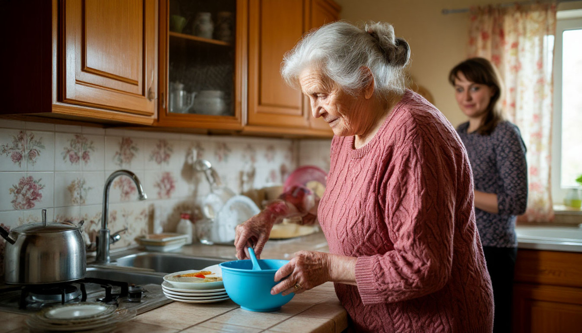 Она замерла, держа в руках мокрую тарелку. Её глаза округлились, но она быстро взяла себя в руки.
