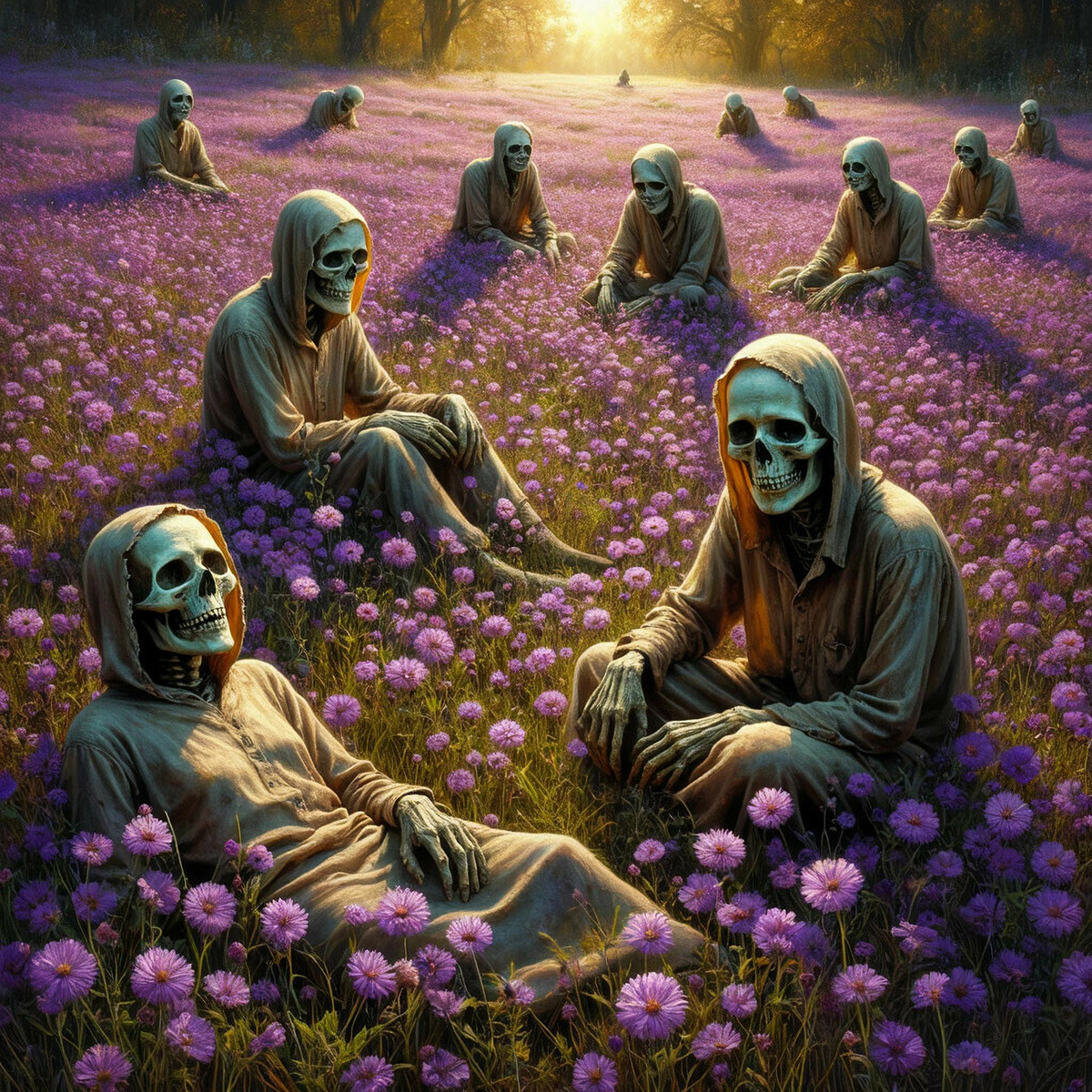 Они сидели прямо в траве, среди цветов. Мужчина в старой фуфайке, обнимающий невидимую жену. Девушка в выцветшем сарафане, протягивающая руку к невидимому ребенку. Старик, смотрящий в небо с восторгом на лице. Их было с десяток. Их одежда истлела, тела высохли, превратились в мумии, но на их лицах застыла одна и та же эмоция. Абсолютное, безмятежное счастье.