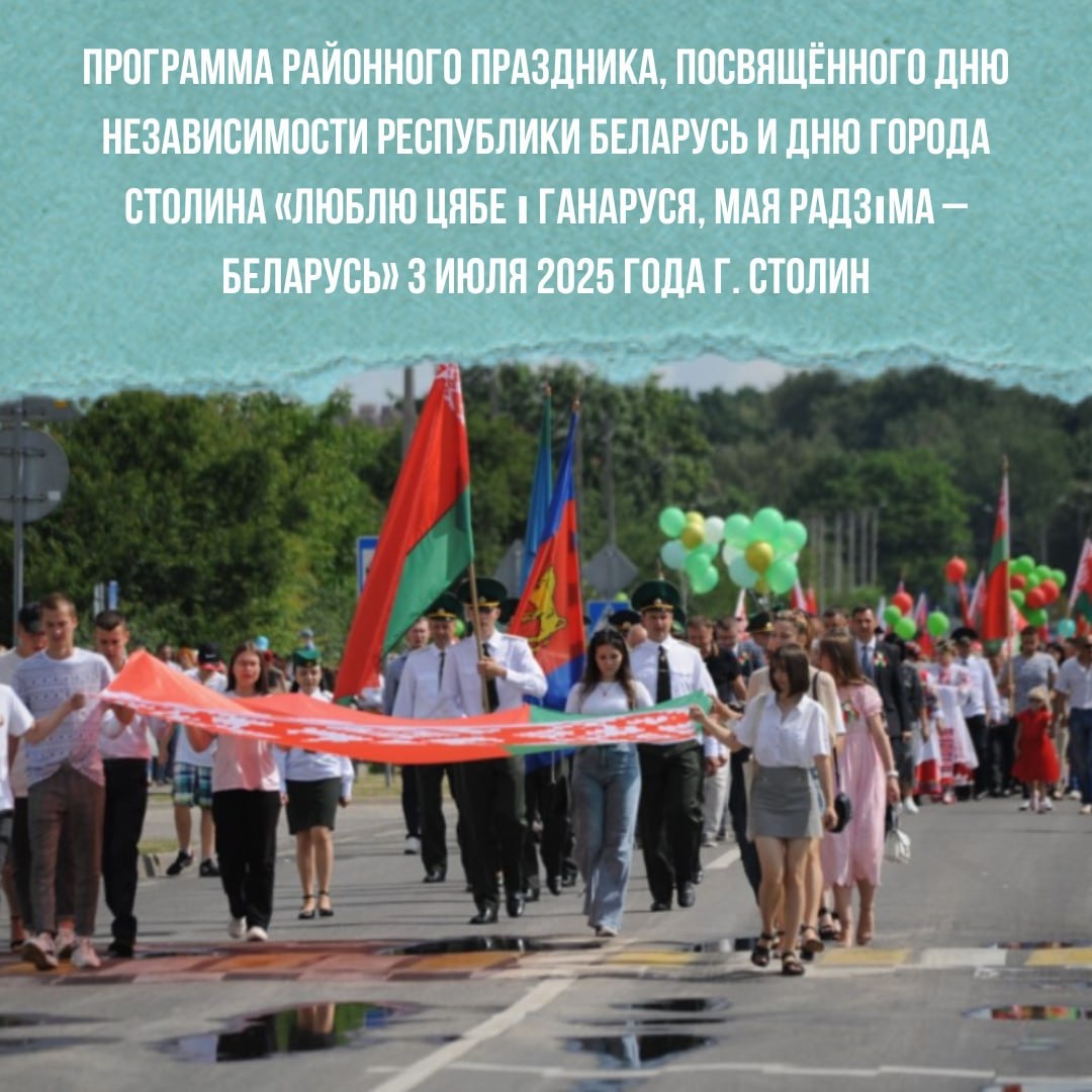 Программа районного праздника, посвящённого Дню Независимости Республики Беларусь и Дню города Столина «Люблю цябе і ганаруся, мая Радзіма – Беларусь» 3 июля 2025 года г. Столин. 👉 Ознакомиться можно на сайте polese.by Движение транспорта 3 июля 2025 года с 5.00 утра до 24.00 часов с улицы Советской переносится на улицу Дзержинского. Планируйте заранее свой маршрут!
