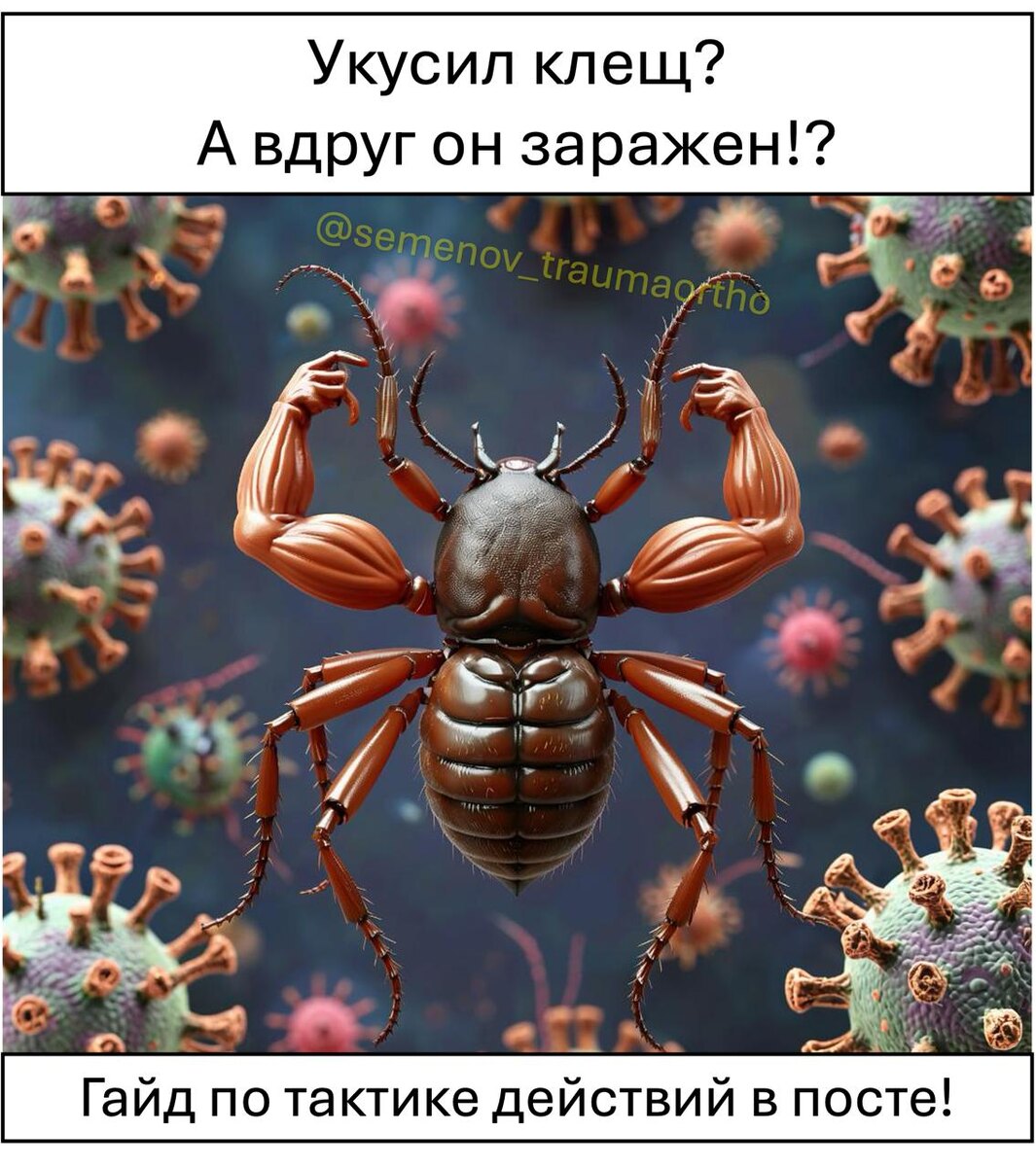 ➡️🚨 Укусил клещ! Что делать?🆘 👋Привет! Андрей Семенов на связи. 👨⚕️ 🔜Скоро лето😄, а значит самое время поговорить про мелких гадких хулиганов, которые периодически портят нам жизнь - про клещей!) ⚠️Клещи могут переносить ОПАСНЫЕ заболевания, а значит нам нужен четкий, надежный и проверенный план действий. 🔥 Я подготовил для вас СУПЕР-ПОДРОБНЫЙ гайд, где разобрал ВСЁ, что нужно знать: • ✅ ПОШАГОВЫЙ АЛГОРИТМ: Что делать СРАЗУ после укуса (первые 4 шага). • 🛠️ КАК ПРАВИЛЬНО СНЯТЬ КЛЕЩА: Подробная инструкция (и что делать КАТЕГОРИЧЕСКИ НЕЛЬЗЯ!). • ☣️ САМЫЕ ОПАСНЫЕ БОЛЕЗНИ: Клещевой энцефалит, Боррелиоз (болезнь Лайма) – рейтинг опасности, смертность и тяжесть осложнений. • 🗺️ КАРТА РИСКА: Где в России самый высокий шанс встретить зараженного клеща? Ссылки на официальные данные Роспотребнадзора. • 💊 ЭКСТРЕННАЯ ПРОФИЛАКТИКА: Иммуноглобулин, антибиотики – когда, кому и зачем (только по назначению врача!). • 👀 Симптомы, на которые нужно обращать внимание в течение месяца