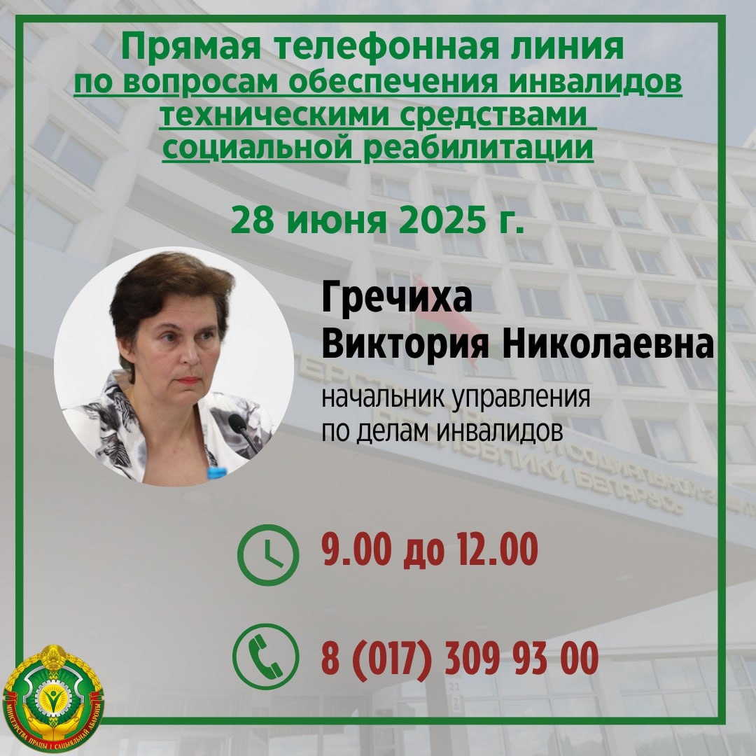 ⚡️Завтра прямая телефонная линия по вопросам обеспечения инвалидов техническими средствами соцреабилитации 28 июня прямую телефонную линию проведет Гречиха Виктория Николаевна – начальник управления по делам инвалидов. ⏰ 9.00 до 12.00 ☎️ (8017) 309 93 00