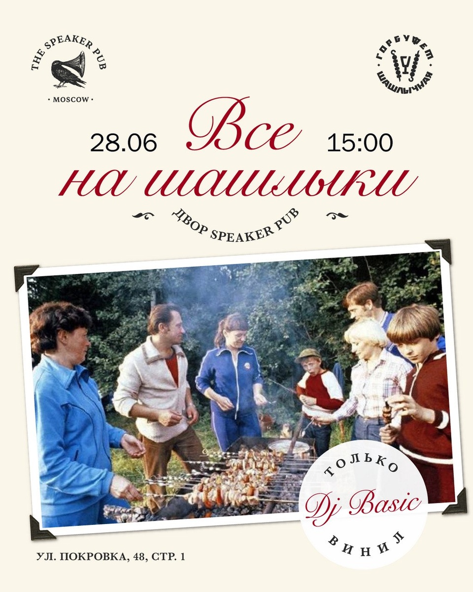 Горбуфет Шашлычная проведет летний пикник в тихом и уютном дворике Speaker pub на Покровке уже в эту субботу. Ожидаются горячие шашлыки с мангала, оливьешечка и вкусные настойки. Цены на шашлык колеблются в районе 700-800₽ за порцию. Начало в 14:00, 28 июня 📍ул. Покровка, 48, стр. 1 #dzen_news