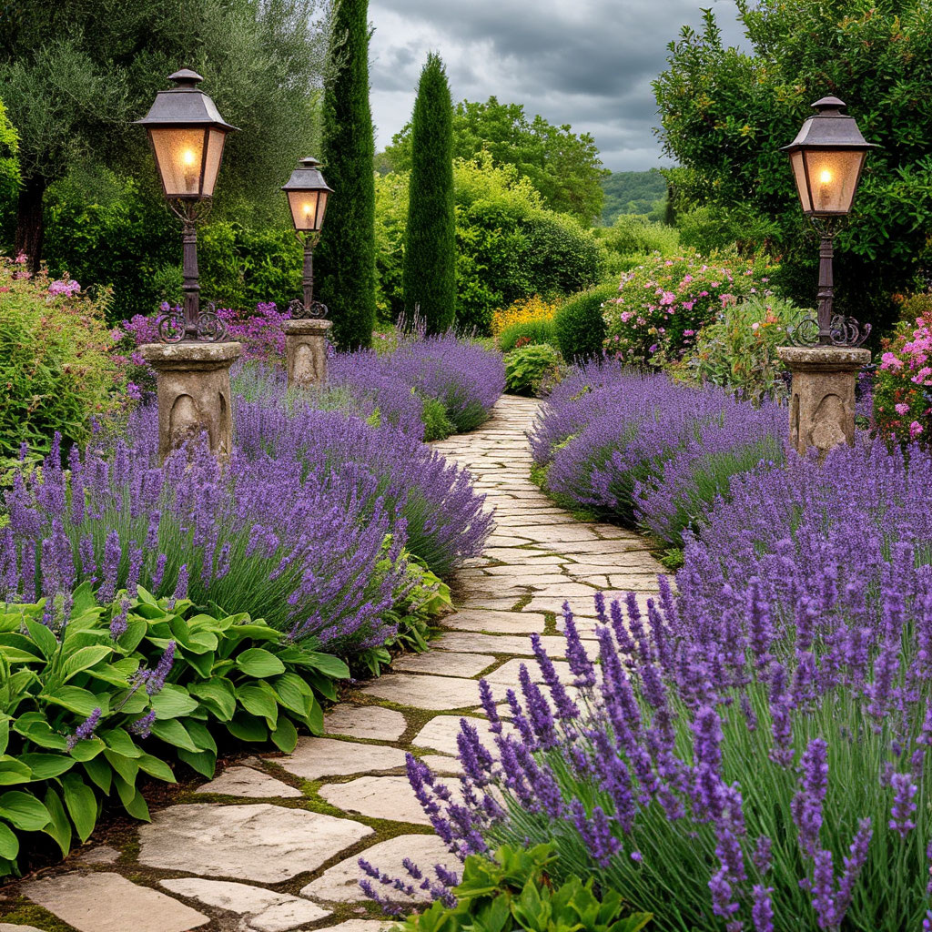 Этот стиль напоминает о юге Франции, где каждая дорожка выглядит так, будто ей уже сотни лет. Используем неровные плиты натурального камня или старый кирпич, оставляя между ними зазоры для тимьяна и других ароматных трав.