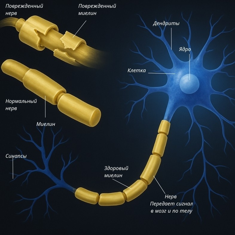 А миелин — это его изоляция. Если изоляции мало или она повреждена — сигнал идёт медленно, с ошибками. В мозге это проявляется как задержка речи, нарушение поведения, трудности в обучении. Вывод? Развитие ребёнка напрямую зависит от уровня миелинизации мозга. Миелин — это специальное вещество, которое покрывает нервные волокна и помогает передавать сигналы быстро и точно.