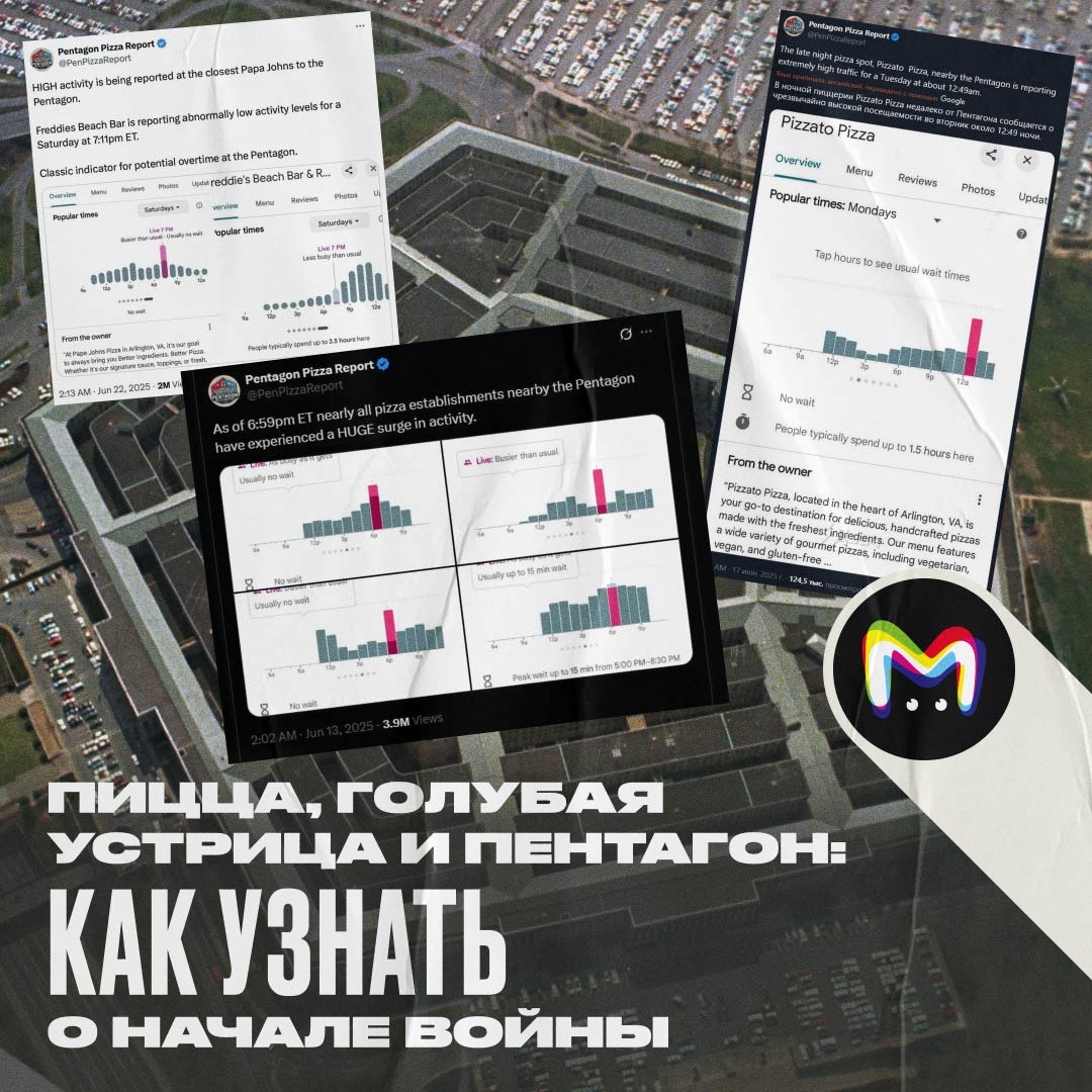 Глобальные мировые события прогнозируют с помощью пиццы и гей*-баров. Если вблизи Пентагона растёт число заказов пиццы — значит, американские генералы и военные аналитики решают, куда нанести сокрушительный удар или вторгнуться вопреки международному праву. Эта тема вновь стала актуальной в сети как раз за пару часов до ударов США по Ирану. Что к чему, каким боком тут бары для либеральных активистов, и с чего всё началось — читайте ниже. Есть такой показатель в Вашингтоне, по которому с очень высокой точностью угадывают вооружённые конфликты и прочие ужасные катаклизмы судьбы. Этому явлению даже дали название. За годы инструментов для слежки тоже прибавилось: Google Live Traffic, Popular Times и заказы через сервисы доставки. При этом некоторые воспринимают Pizza Indicator как пародию на OSINT, где люди отслеживают полёты правительственных рейсов через Flightradar24, анализируют энергопотребление военных баз по спутниковым снимкам и делают выводы о событиях по данным из открытых источн
