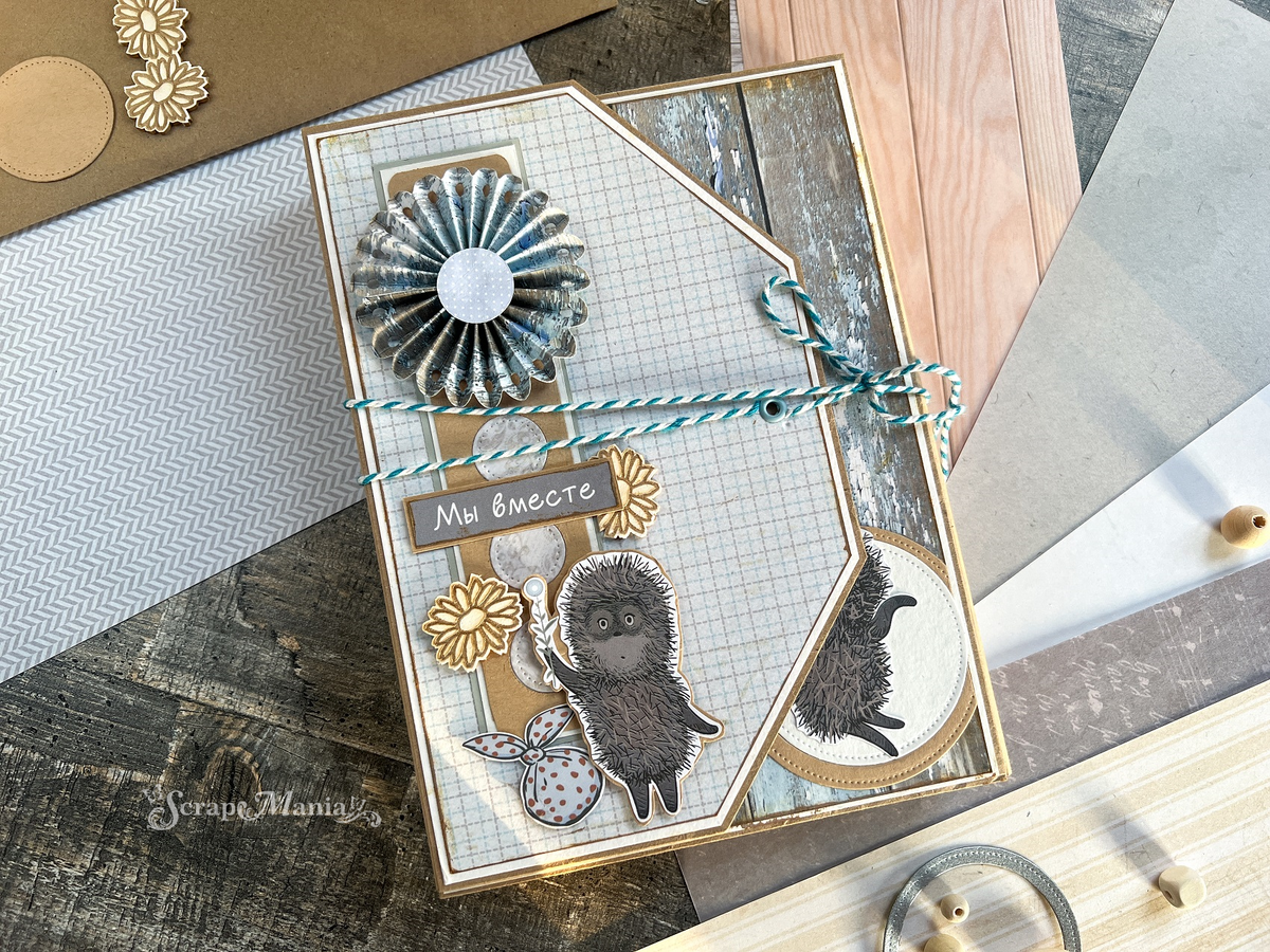 Итак, обложка. Её основу я сложила из плотного картона, примерно 300 гр. Главное при этом - чтобы картон хорошо, без заломов биговался. Оформила скрапбумагой. И вот на этом моменте хочу заострить внимание на универсальности коллекций от ScrapMania. И на том, как они прекрасно сочетаются друг с другом. Для создания фотопапки у меня было два набора - набор бумаги 20х20 "Ёжик в тумане" и набор бумаги А5 для вырезания "Ёжик в тумане". Для задуманной конструкции этих наборов оказалось недостаточно. Что делать?) - Так я думала недолго, и, пересмотрев свои запасы нашла то, что нужно. На помощь пришли листы из абсолютно разных по темам коллекций - бумага "Идеальный мужчина. Карточки", бумага "Волшебник. Заклинание", бумага "Волшебный снегопад. Торжественный декор". А также несколько листов для вырезания 10х30. И эти принты сногсшибательно подошли друг к другу.