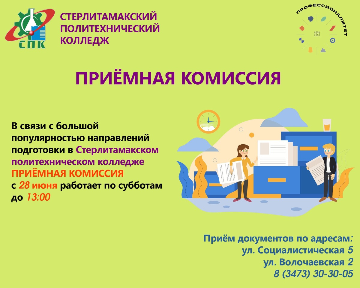 В связи с большой популярностью направлений подготовки в Стерлитамакском политехническом колледже приёмная комиссия с 28 июня работает по субботам до 13:00. #стерлитамакскийполитехническийколледж #СоюзМаш #СоюзМашБашкирия #профессионалитет02 #Профессионалитет #ИРПО #85ЛетСПО #СПО #МолодёжьИДети #НацпроектМолодёжьИДети #МедиаЦентрСТР #СПОмедиа