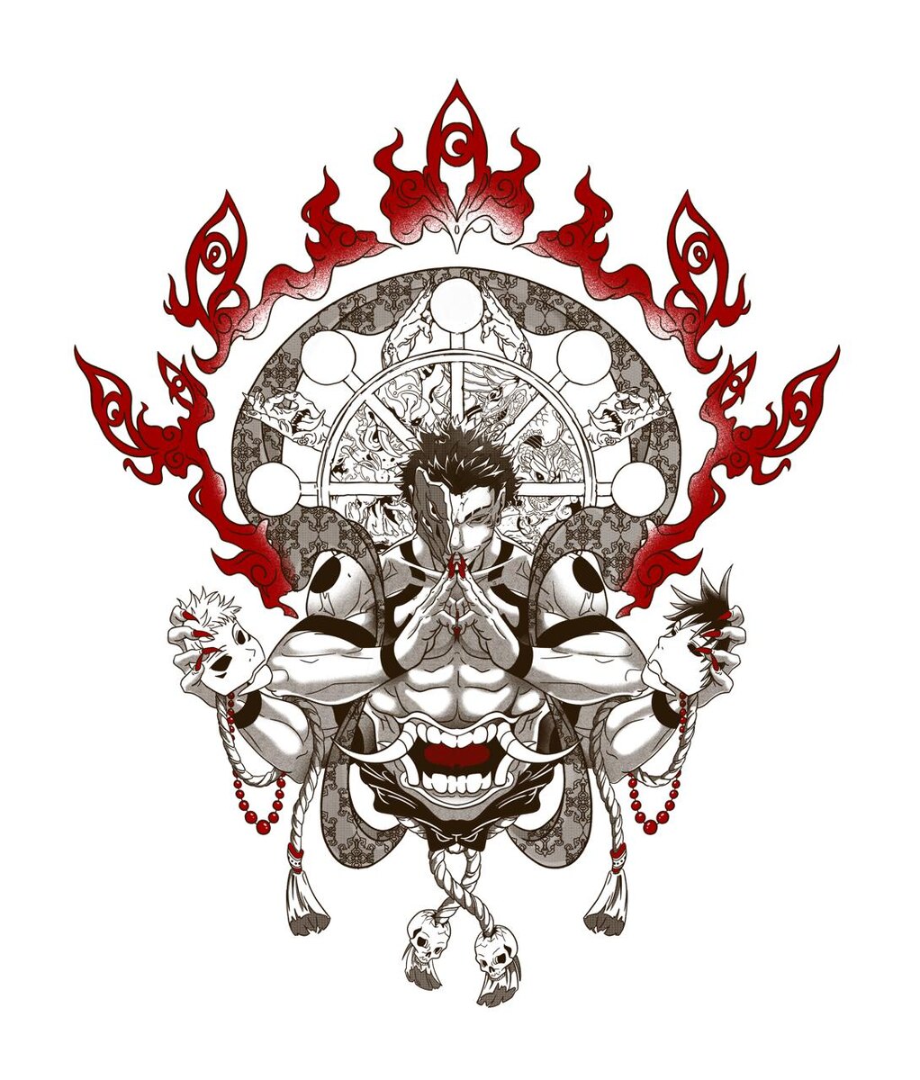 На спине Худи изображена первичная форма Сукуны, держащая в руках маски в виде Итодори и Мегумина. Такой жест напоминает нам о “сосудах”, за счет которых существовал и боролся антагонист.