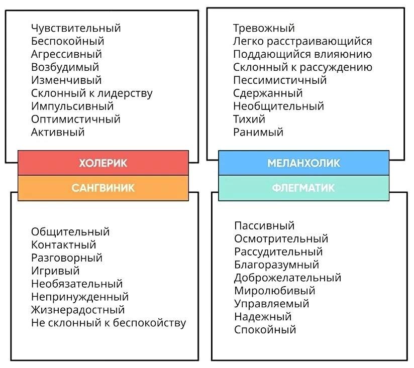 ✅Типы темперамента - это индивидуальные различия в поведении и эмоциональных реакциях человека, которые определяются его физиологическими и психологическими особенностями. 📍Существует четыре основных типа темперамента: сангвиник, холерик, флегматик и меланхолик. ✅ Каждый тип имеет свои особенности, сильные и слабые стороны, а также преимущества и недостатки в различных сферах жизни. 📍Знание своего типа темперамента может помочь людям лучше понимать себя и других, а также более эффективно управлять своими эмоциями и поведением.