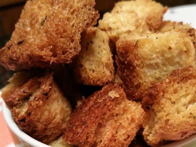 Гренки из старой гамбургерной булочки Вы когда-нибудь задумывались, что делать со старыми булочками для гамбургеров? Не выбрасывайте их! Превратите их в аппетитные гренки! Они очень вкусные, вы не пожалеете, если сделаете их! Это может подойти к любому блюду, которое вы готовите. Если хотите, можете посыпать их сыром пармезан перед выпечкой. ⌛ Подготовка: 10 мин. ⏰ Приготовление: 20 мин. 🍴 Количество: 10 порций Ингредиенты ✅ оливковое масло или по необходимости ✅ 4 булочки для гамбургеров, порезанные на 2.50 см кубики ✅ ½ чайной ложки чесночного порошка ✅ 0.13 чайной ложки сушеного орегано ✅ 0.13 чайной ложки молотого тимьяна ✅ 0.13 чайной ложки сушеного базилика ✅ соль по вкусу ✅ крупно молотый черный перец по вкусу Инструкция приготовления 1. Разогрейте духовку до 175 градусов C. 2. Разбрызгайте оливковое масло на кубики булочек для гамбургеров в большой миске; бросьте, чтобы они покрылись слоем. Разложите кубики на листе для выпечки. Посыпьте кубики чесночным порошком, орега