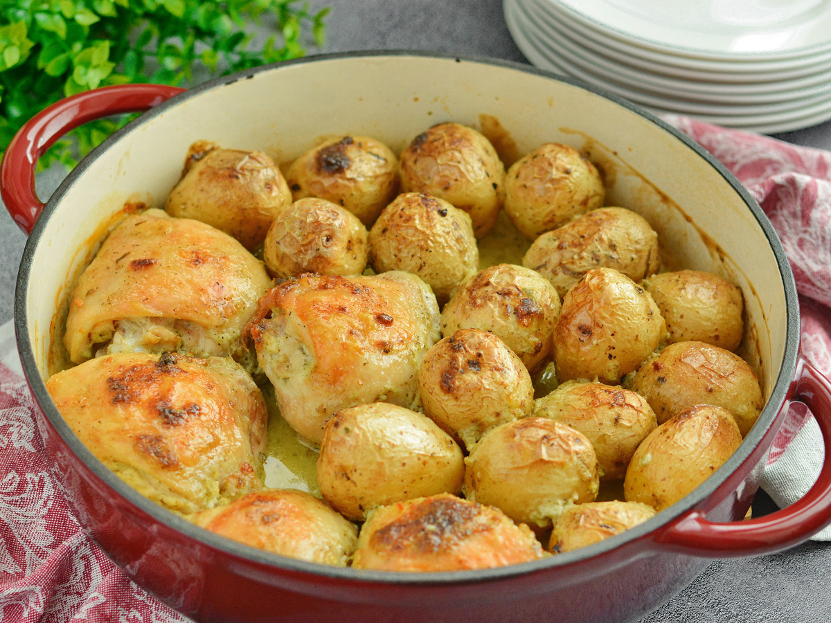 Курица запекается до золотистой корочки, оставаясь внутри сочной и ароматной, с тёплым запахом чеснока и капелькой песто. Картошка – мягкая, как из русской печки, с хрустинкой снаружи и насыщенным вкусом внутри, будто впитала всё самое вкусное от курицы и соуса. Блюдо очень простое, но безумно вкусное! Полный список ингредиентов – в конце⤵ Готовим курицу и гарнир в одной форме. Сначала промываем 1 кг мелкого (бэби) картофеля жёсткой губкой, не чистим. Чистим 2 зубчика чеснока. Берём 1 кг куриных бёдер – можно заменить на голени или крылья, если есть под рукой. Больше фото смотрите тут: Смешиваем 100 г майонеза, 1 ч.л. соуса песто, мелко нарезанные 1 ч.л. каперсов, выдавленный чеснок, 1 ч.л. соли и 1/4 ч.л. чёрного перца. Разбавляем всё 50 мл воды – получается чуть текучий, ароматный соус. Он всё решает – и вкус, и сочность, и румяную корочку. Половину полученного соуса выкладываем в миску с картофелем, перемешиваем руками – чтобы каждый клубень был покрыт. Вторую половину распределяем