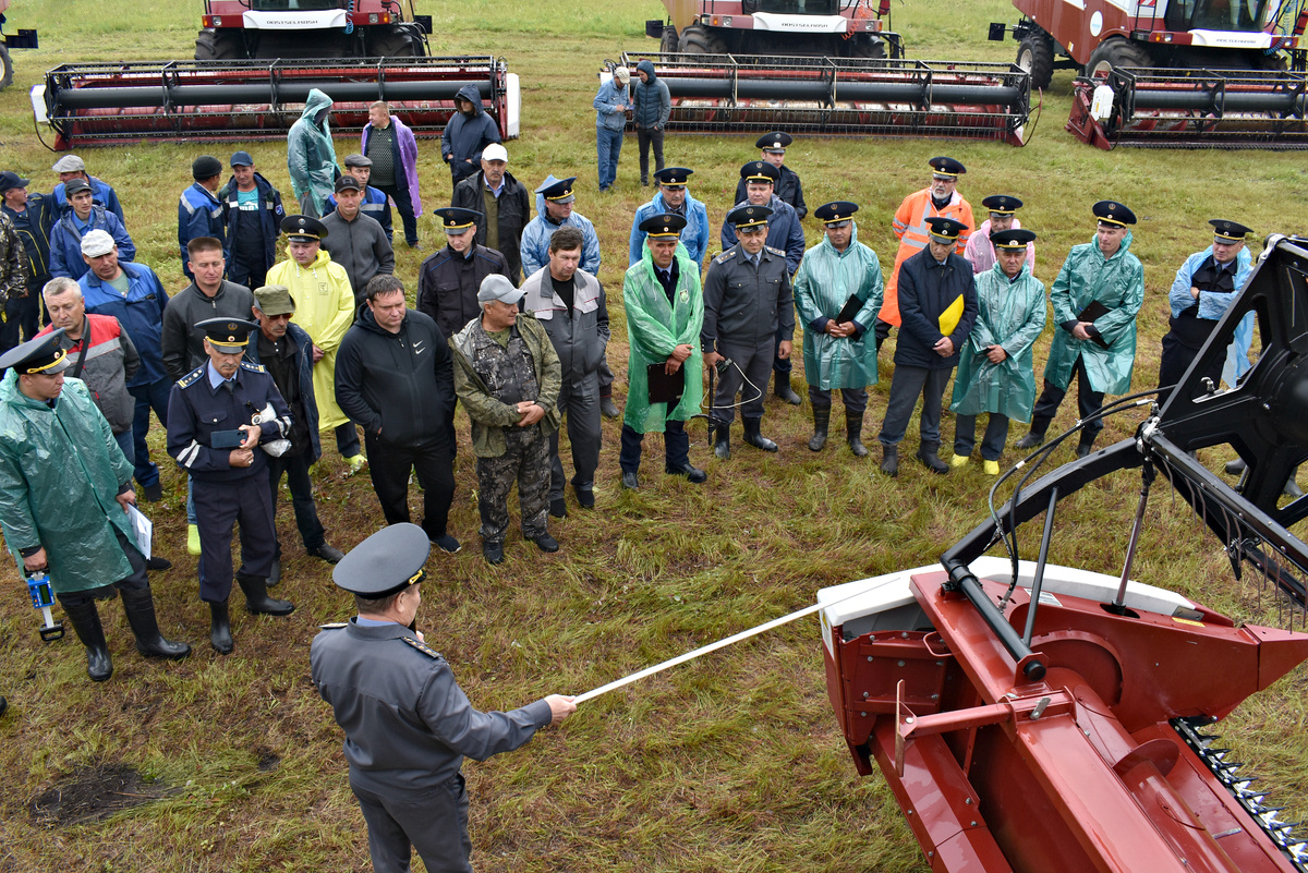 Далее семинар переместился в практическую плоскость. Инженеры-инспекторы Фархат Тагиров и Ильдар Хабиров на примере зерноуборочного комбайна Т-500 напомнили нормативные требования, предъявляемые при проведении технического осмотра, и продемонстрировали участникам порядок проведения государственного технического осмотра с применением диагностических приборов с последующей выдачей карты контроля в компьютерном исполнении. Они напомнили механизаторам требования безопасности при обслуживании и ремонте техники, а также организации безопасных маршрутов ее перегона к местам полевых работ. Кроме того на импровизированной уборочной площадке была проведена проверка герметичности комбайна - тест показал слабые звенья агрегата.
