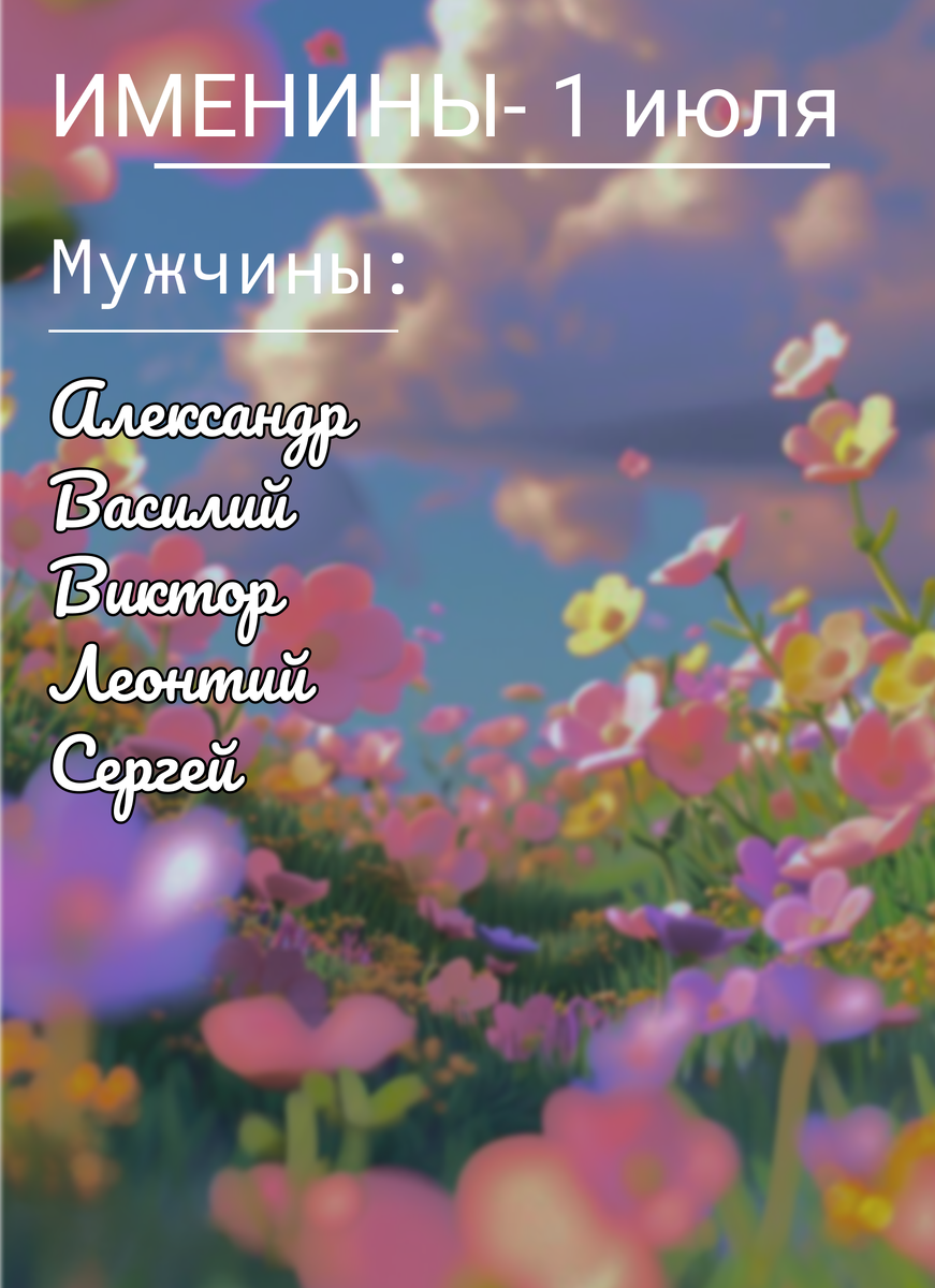 Мужчины: Александр- от древнегреческого имени Александрос, состоящее из: «алекс»- «защищать», «отражать», «помогать» и «андрос»- «мужчина», «человек», «муж». На Руси имя прижилось благодаря появлению святых покровителей, главным из которых стал Александр Невский и означает «защитник людей» или «оберегающий мужей». Василий- от древнегреческого имени Басилейос, что означает «царский» и «царственный». Виктор- от латинского слова Виктор, что означает «победитель». Леонтий- от древнегреческого имени Леонтиос, которое произошло от слова «леонтейос» и означает «львиный». Сергей- от римского родового имени Сергиус, которое означает «знатный», «высокий». С латинского языка означает «слуга Бога», «высокочтимый», «высокий», «знатный». Считается, что на Руси имя появилось после принятия христианства (крещение Руси произошло в 988 году) и сначала было распространено среди духовенства (Сергий), а начиная с 18 века уже использовалось среди простых жителей. Также, этим именем нарекали и царственных ос