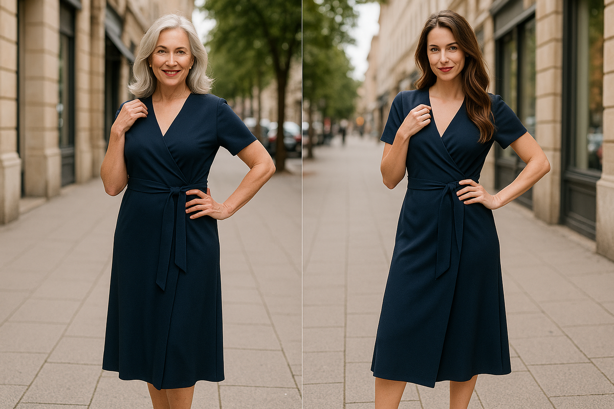💡 Секрет фасона: запах создаёт диагональ — визуально вытягивает силуэт, скрывает складки на животе и делает образ стройнее. Работает как в 45, так и в 65, потому что форма — универсальна.