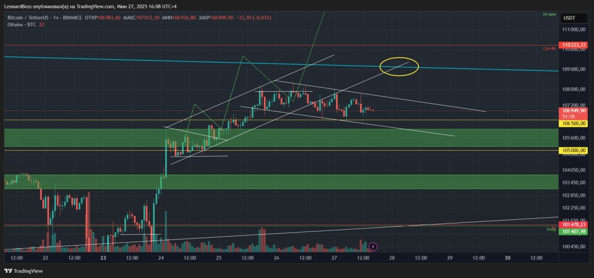 В ответ на пост #BTC 🕯Локально + Глобально🕯 Коллеги, всем привет! Появилась небольшая пауза между моими передвижениями. Посмотрим, что есть и что нас ждет на выходных?? ⚠️Итак, локально имеем коррекционный откат, о котором сказал в предыдущем обзоре. Логичным был бы удар в блок и выход обратно в сторону HI, такой сценарий буду ждать, в сответствии с ним и движение по альтам, уверен понимаете какое?! Очень много шортистов активизировались, а всем известный лудоман на HyperL снова открыл шорт с х20 плечем на пару десятков миллионов, с ликвидацией в районе 115К. Ранее он уже потерял на плечах 30млн$!! ⚠️Глобально, 2й график 1D ТФ, я бы даже сказал среднесрочно, нарисовался красивый треугольник, который да, может пробиваться в обе стороны, но именно сейчас приоритет на стороне роста, с учетом реакции на уровень 100К. Опять же, место для заполнения трейгольника еще имеется и пару ретестов границ в обе стороны очень даже можем увитеть, но, такое движение практически в боковике снова дас