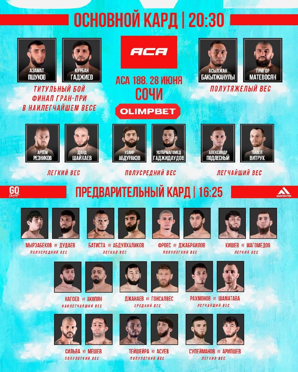 Обновленный кард АСА 188 по результатам взвешивания. Обратите внимание, что один поединок отменили и поэтому старт турнира сместился на 16:25 МСК. Информация где смотреть АСА 188 https://mmalenta.ru/news/asa-188-gde-smotret-onlayn-translyatsiyu.html Источник https://dzen.ru/id/684af1550a4ab554ebb81e3c