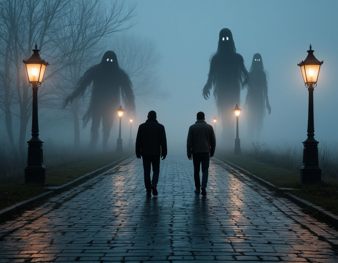 Их окружал туман, но теперь он сгущался, становился живым. В нём шевелилось что-то. Как будто фигуры — неясные, зыбкие — вырастали из воздуха. Они не приближались, просто появлялись. Молчаливые, как дым. Как память, которую боишься вспомнить. Призрачные силуэты, чьи движения напоминали шаги, но в такт чужому ритму. Один — наклонённый, с ломаной походкой. Другой — в платье, с перекошенным лицом. Третий — просто тень, без формы, но со взглядом, который чувствовался спиной.