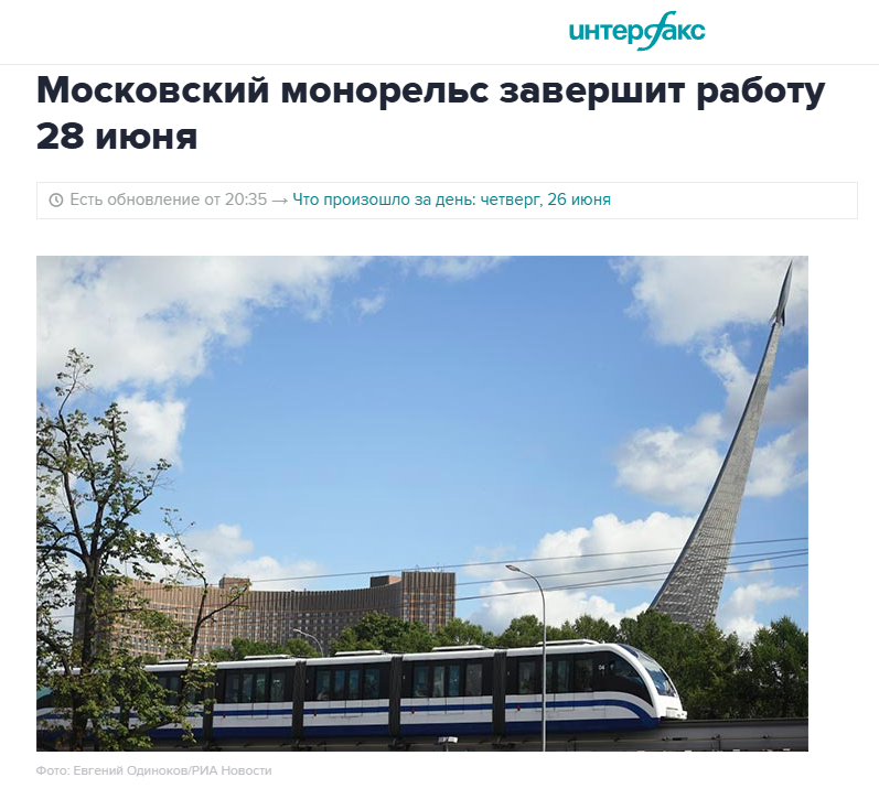 28 июня 2025 года Московский монорельс прекращает своё существование. Об этом официально объявили в Департаменте транспорта столицы. Однако, на базе эстакады появится первый в России прогулочный парк на высоте. Ранее за этот проект проголосовали 71% участников на портале «Активный гражданин». Монорельс был запущен более 20 лет назад как инновационный городской транспорт, но стать частью системы ему не удалось. Монорельс не связан с другими видами транспорта, что усложняя его использование, сама линия короткая, а вагоны крайне дорогие. Ежегодные затраты на обслуживание монорельса превышают 800 млн рублей. Уже в 2008 году власти стали обсуждать его закрытие. Последняя попытка сохранить маршрут в эксплуатации теперь официально признана неудачной. Согласно опубликованному плану, демонтаж части эстакады начнётся с участка между станцией «Выставочный центр» и депо. В частности, будет снесена станция «Улица Сергея Эйзенштейна», что позволит открыть вид на главный вход ВДНХ. Ожидается, что н