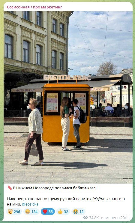 Люди поворчали, поохали, да про квас тот забыли — трендом или мемом он так и не стал. Рекламу, тем не менее, точка получила отличную. Отыскать ларёк (спасибо, Оксана) и приобщиться к странному, патриотичному напитку можно напротив 20-го дома на улице Большой Покровской, там ещё ресторан «Министерство завтраков». У меня это был вообще первый опыт знакомства с тапиокой и концепцией бабл-ти как такового, и, опираясь на него, я настоятельно не рекомендую именно бабл-квас начинающим. Похоже на газированный холодный чай с чётким хлебным послевкусием и вкусными, немного приторными шариками желе. И всё-таки берёт какое-то странное чувство гордости за людскую смекалку и изобретательность. Да, казанцы уже переплюнули Нижний своим Айран Манго Баблом, но это случилось позже, и я подозреваю, что не без оглядки на нижегородских коллег. #nino #gde_pozhrat