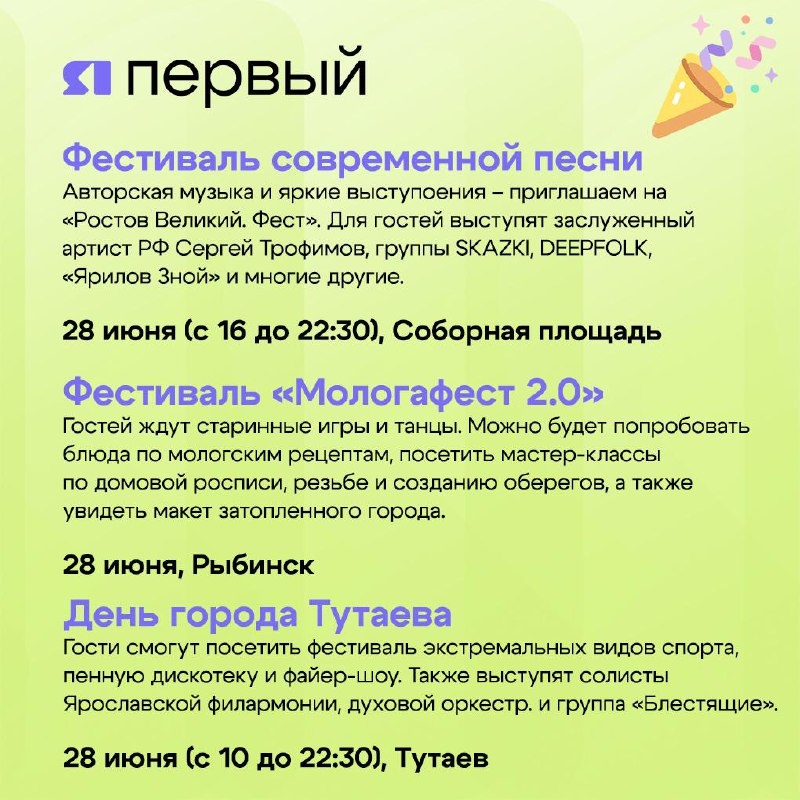 🎉 На этнофестиваль в Рыбинск, послушать современную музыку в Ростове Великом, а потом ещё заехать в Тутаев на День города. Там ведь группа «Блестящие» выступает!
