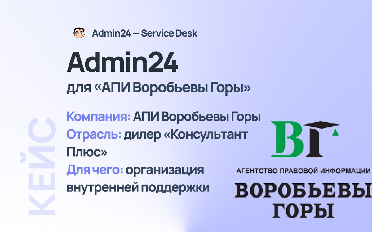 Недавно к нам обратилось АО Агентство правовой информации «Воробьевы Горы» («АПИ Воробьевы Горы») – компания, работающая в сфере информационных технологий с 1994 года. Дилер «Консультант Плюс», специализируется на адаптации, модификации и сопровождении Справочных Правовых Систем КонсультантПлюс. 🔗 Рассказываем в новом кейсе, как Admin24 помог создать прозрачную и эффективную систему учета и обработки заявок от сотрудников.
