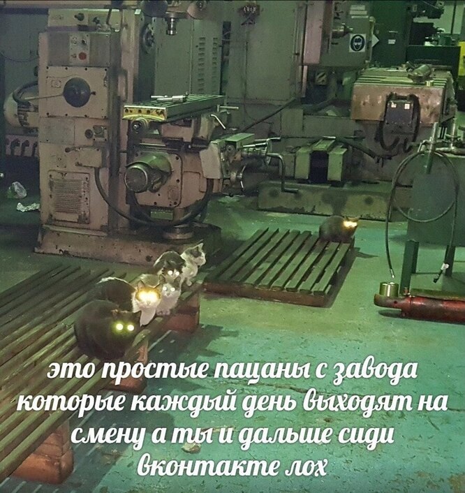 Кто сказал, что завод — это только шум, металл и работа? Знакомьтесь с мемными обитателями цехов, которые поднимают настроение и делают рабочие будни ярче! Эти коты точно знают толк в заводском уюте.