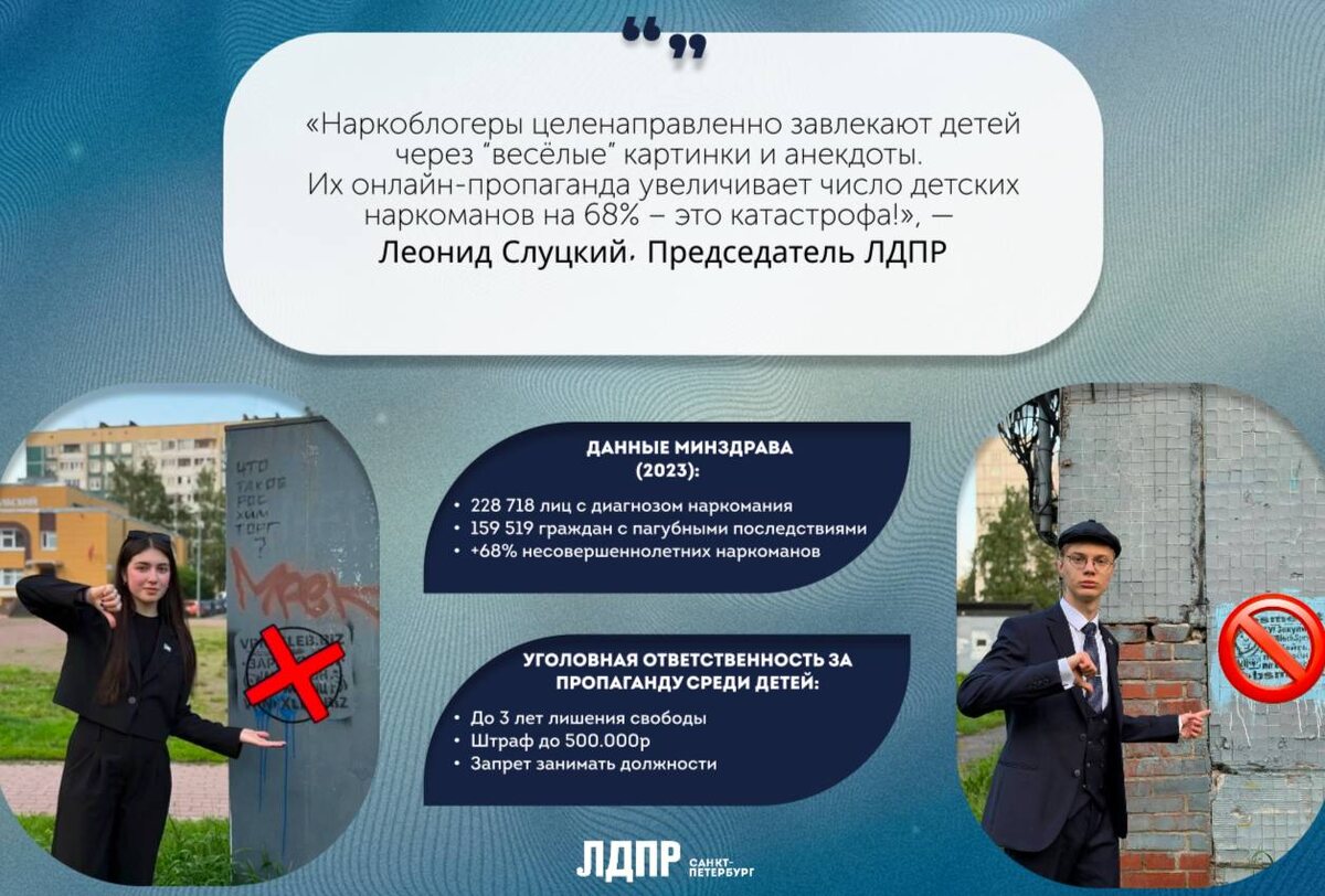 ЛДПР предлагает ужесточить ответственность за пропаганду наркотиков среди детей Депутаты фракции ЛДПР во главе с Леонидом Слуцким внесли законопроект, предусматривающий уголовную ответственность за пропаганду наркотиков, психотропных веществ и их аналогов среди несовершеннолетних. Предлагается лишать свободы до 3 лет, вводить штрафы до 500 тысяч рублей, а также применять обязательные, исправительные или принудительные работы с лишением права занимать определённые должности. Главная цель нашего законопроекта - расширить возможности правоохранительных органов для борьбы с целенаправленной пропагандой наркотиков как в офлайн, так и в онлайн-пространстве - соцсетях, мессенджерах, форумах и видеохостингах. По данным Минздрава, число несовершеннолетних с диагнозом «наркомания» выросло на 68%, что свидетельствует о критической ситуации. Современные наркоблогеры используют «весёлые картинки», анекдоты и псевдоинформацию, чтобы привлечь детей к употреблению наркотиков. Законопроект направле