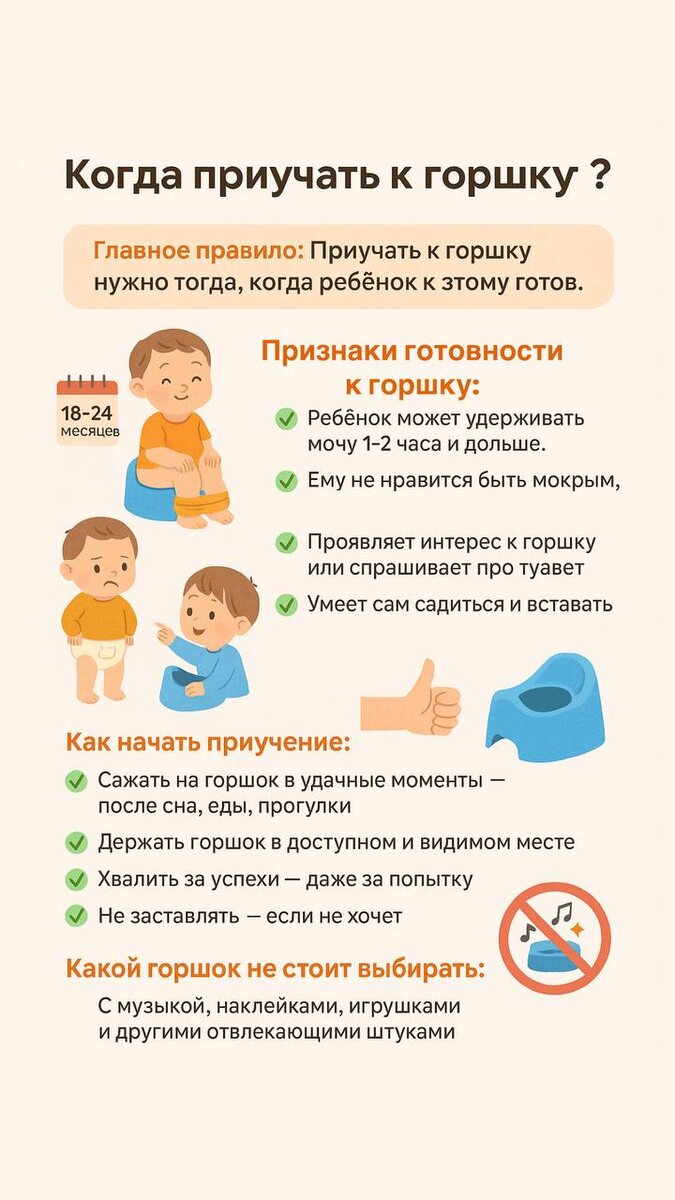 Когда приучать к горшку? 🤩🤩🤩🤩🤩🤩🤩🤩🤩🤩 Одна из моих любимых тем! Потому что психологические запоры — частое явление. И часто они бывают связаны с слишком ранним приучением к горшку. 📍Главное правило: Приучать к горшку нужно тогда, когда ребёнок к этому готов. 🕜Обычно это происходит в возрасте от 18 до 24 месяцев, но иногда — ближе к 3–3.5 годам.🕜 🌊Признаки готовности к горшку: ▶️Ребёнок может удерживать мочу 1–2 часа и дольше. ▶️Ему не нравится быть мокрым, особенно если он дома без подгузника. ▶️Проявляет интерес к горшку или спрашивает про туалет. ▶️Умеет сам садиться и вставать с горшка. 💬Как начать приучение: ✅Предлагать горшок в удачные моменты — после сна, еды, прогулки. ✅Держать горшок в доступном и видимом месте. ✅Хвалить за успехи — даже за попытку. ✅Не заставлять — если не хочет, значит пока не время. ❌ Какой горшок не стоит выбирать: ‼️С музыкой, наклейками, игрушками и другими отвлекающими штуками. ✅ Лучше — простой, устойчивый и удобный. 💚Если всё делать