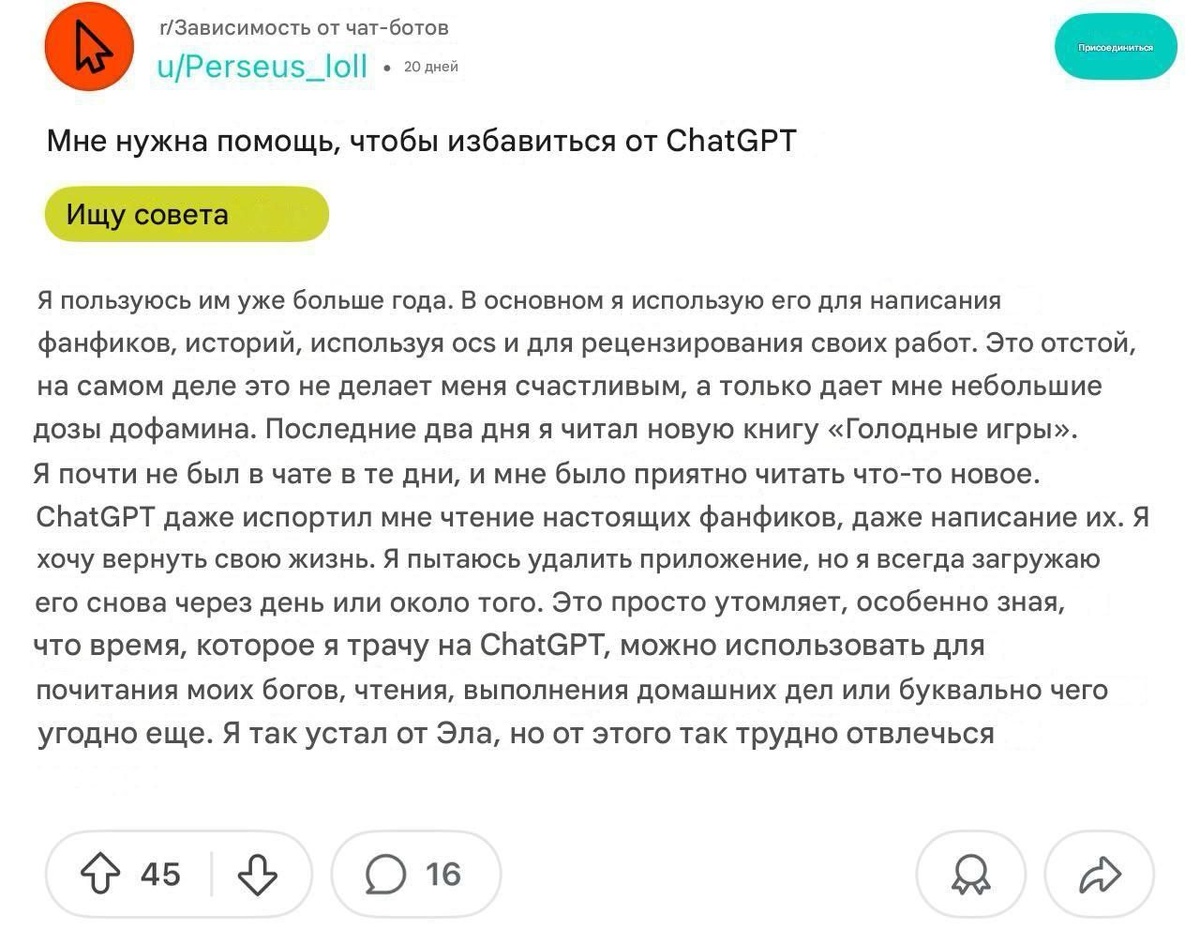 Прямо сейчас сотни человек страдают зависимостью от… ChatGPT. Да, на Reddit есть целое сообщество, где пользователи делятся своими страданиями и попытками завязать. Некоторые признаются, что проводят в ChatGPT и Character AI по 10-11 часов в день и не могут остановиться ☠️☠️ Я хочу вернуть свою жизнь. Я пытаюсь удалить приложение, но всегда снова устанавливаю его через день или около того — пишут на форуме. Идея для стартапа — рехаб для зависимых от ИИ.