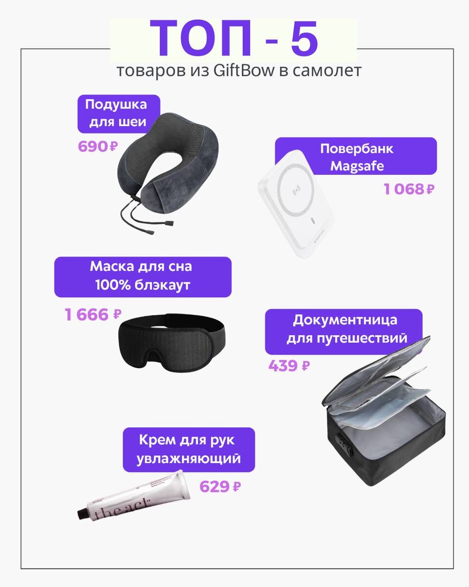 ✈️ТОП–5 товаров из GiftBow в самолет Собираетесь в путешествие? Собрали для вас мелочи, которые сделают ваш полет комфортным: 📌Подушка для шеи — 690 ₽ 📌Повербанк Magsafe — 1 068 ₽ 📌Маска для сна 100% блэкаут — 1 666 ₽ 📌Документница для путешествий — 439 ₽ 📌Крем для рук увлажняющий — 629 ₽ ✨А ещё больше идей ищите в GiftBow — добавляйте в вишлист, чтобы не забыть! @giftbowru #wishlistнедели