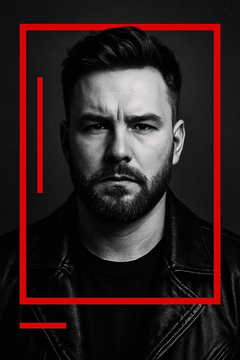 A high-contrast, black-and-white hyperrealistic portrait of Max Goldenber, 8K resolution, Hasselblad X2D 100C quality. He has a calm yet intense stare — the look of a man who’s seen battles, both in the ring and in life. His beard is sharply defined, hair styled with volume and edge. He wears a rugged black leather jacket with an open collar — evoking streetwear mixed with the spirit of old-school fight culture.
