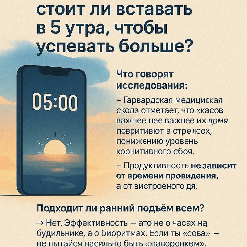 🗞️ FOMily •NEWS• 💤 Скорость вместо сна: стоит ли вставать в 5 утра, чтобы успевать больше? 📈 В интернете культ «раннего подъёма» — в TikTok и YouTube десятки блогеров показывают, как в 5 утра бегают, медитируют, читают и зарабатывают миллионы. Но работает ли это в реальности? 🔬 Что говорят исследования: — Гарвардская медицинская школа отмечает, что качество сна важнее его времени. Для «сов» принудительный ранний подъём может привести к стрессу, понижению когнитивных функций и гормональному сбою. — Исследование University of Westminster показало: те, кто просыпается до 5:30 утра, имеют повышенный уровень кортизола (гормона стресса) в течение всего дня. — Продуктивность не зависит от времени пробуждения, а от выстроенного режима, отсутствия перегрузки и умения концентрироваться. 🧠 Подходит ли ранний подъём всем? → Нет. Эффективность — это не о часах на будильнике, а о биоритмах. Если ты «сова» — не пытайся насильно быть «жаворонком». Главное — осознанность и системность. ⚠️