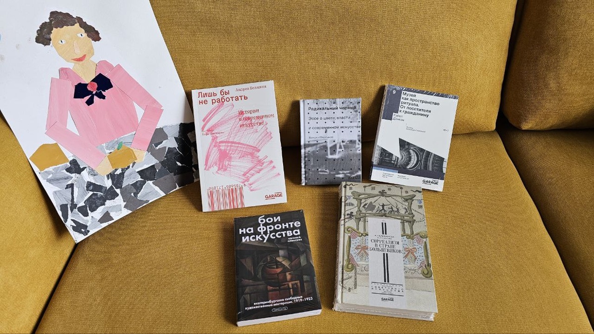 Новые книги об искусстве на фоне коллажа сына, который он вчера сделал в творческом кружке.