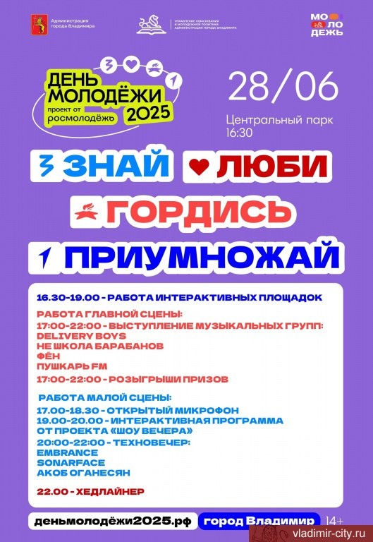 Программа празднования Дня молодежи во Владимире В эту субботу, 28 июня, Владимир станет центром праздничных событий. В Центральном парке культуры и отдыха состоятся сразу два масштабных мероприятия — День молодежи и торжественное закрытие международного фестиваля скульпторов «Владимир — Белокаменная столица». Кульминацией вечера станет электронная вечеринка с древнерусскими мотивами «Техновече» — с 20:30 у колеса обозрения выступят Embrance, Sonarface и Акоб Оганесян. А в 22:00 на главной сцене прозвучит концерт хэдлайнера — исполнителя «3-ий Январь» (Алексей Земляникин). Многие знают его по хиту «Хубба Бубба».