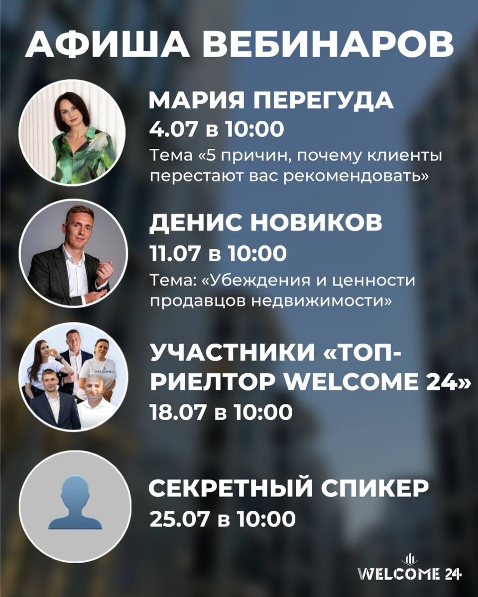 Июль, который повысит ваш профессиональный уровень 🔥 Готовьтесь: вас ждёт интересная серия вебинаров в WELCOME 24 Новые спикеры, новые темы, новые знания и новый ТЫ 🤩 🔹 4 июля в 10:00 Мария Перегуда — «5 причин, почему клиенты перестают вас рекомендовать» 👉🏼Как не терять сарафанку и превращать довольных клиентов в источник новых сделок 🔹 11 июля в 10:00 Денис Новиков — «Убеждения и ценности продавцов недвижимости» 👉🏼Что сидит в голове у сильных агентов? А что мешает продавать? 🔹 18 июля в 10:00 Открытая встреча с участниками челленджа «Топ-риелтор WELCOME 24» 👉🏼Полгода спустя: кто чего достиг? Чьи ожидания не оправдались? Честный разбор пути каждого 🔹 25 июля в 10:00 Секретный спикер 👉🏼Пока не скажем кто. Но вы точно захотите быть на этом эфире 📍 Все вебинары пройдут в нашем телеграм-канале Не пропусти, июль будет жарким 🔥