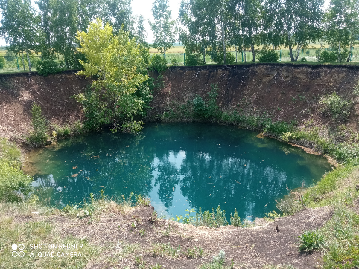 Было это в далёком 1939 году: ехал трактор по полю(думаю, что гусеничный, очень тяжелый) и вдруг провалился под землю... Ясно дело, что глубину замерить было нечем. Но очевидцы говорили о 40 м. Из дыры раздавался шум работающего двигателя трактора... Тракториста достать не смогли - техники для подобных действий в те года не было. Края с годами стали осыпаться, а на дне появилась вода. Сейчас озеро похоже на кратер от метеорита! Вот такое чудо природы есть в Татарстане, недалеко от города Альметьевск. Место жутковатое, но интересное.
