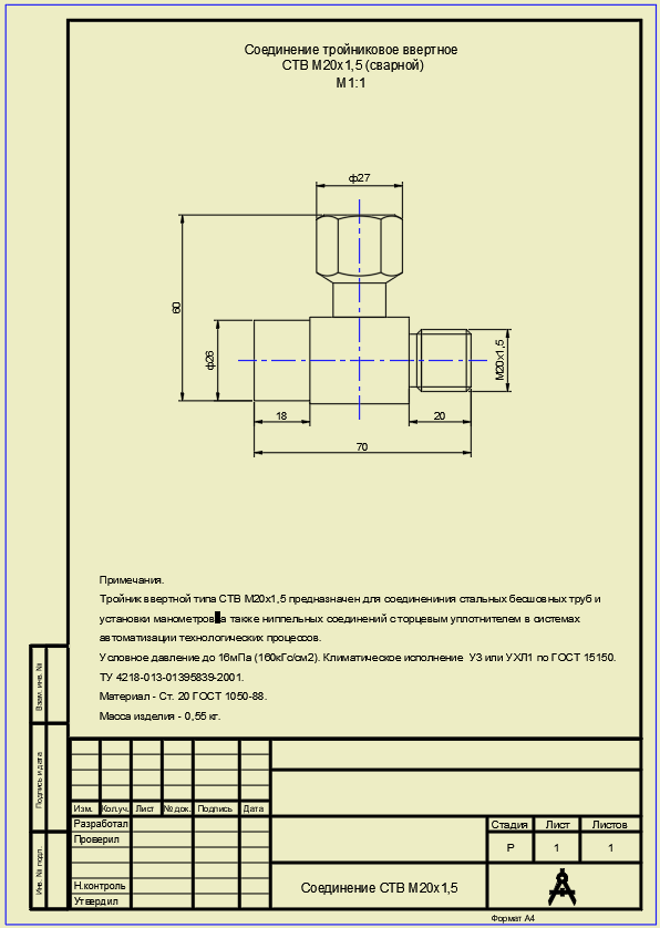 Тройник ввертной предназначен для: · Соединения стальных бесшовных труб · Установке манометров · Монтаже ниппельных соединений с торцевым уплотнителем · Использования в системах автоматизации технологических процессов · Тип резьбы: М20х1,5 · Условное давление: до 16 МПа (160 кгс/см²) · Климатическое исполнение: У3 или УХЛ1 по ГОСТ 15150 · Технические условия: ТУ 4218-013-01395839-2001 Соединение может быть изготовлено из следующих материалов: · Ст.20 - углеродистая сталь · Ст.09Г2С - морозостойкая сталь · Ст.08х18н10 - нержавеющая сталь · Ст.12х18н10т - нержавеющая сталь · Тип соединения: ввертное · Конструкция: сварная · Тип уплотнения: торцевое · Способ монтажа: ввертный · Системы автоматизации технологических процессов · Промышленные установки · Системы контроля и измерения · Технологические трубопроводы · Высокая прочность конструкции · Возможность работы при высоком давлении · Устойчивость к воздействию рабочей среды · Простота монтажа и обслуживания · Долговечность эксплуатации ·