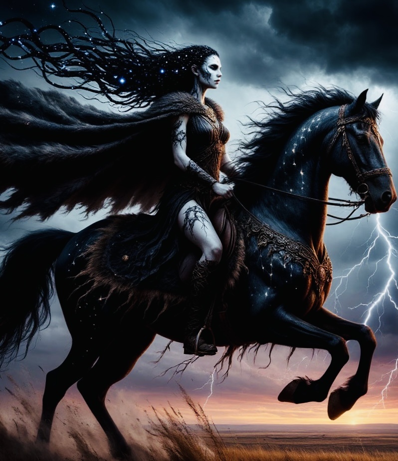 Лошадь яростно забила передними копытами, а в небе сверкнула яркая молния, сопровождающаяся небесным рокотом.