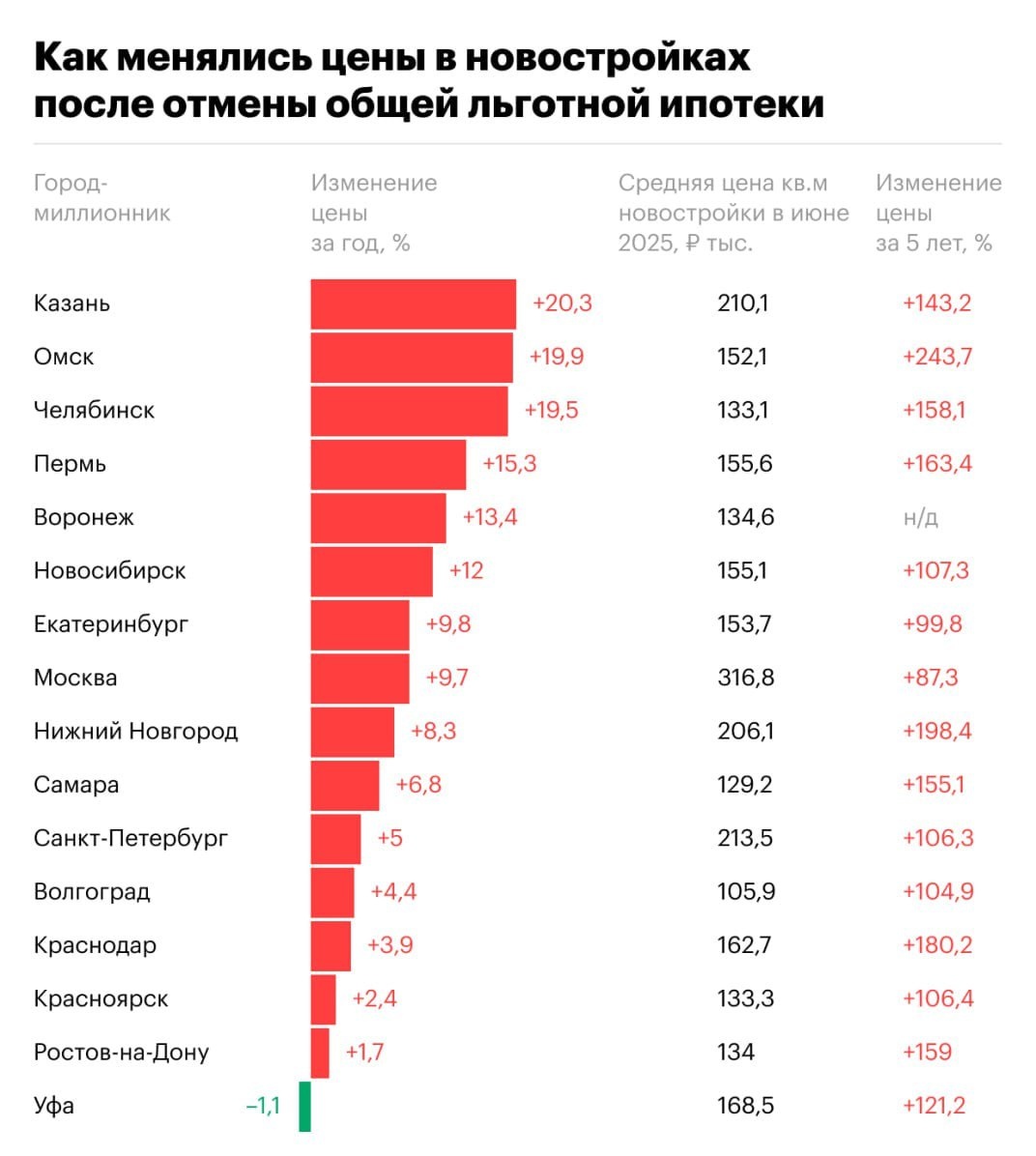 ⚡️ Отмена массовой льготной ипотеки в июне прошлого года не смогла остановить рост цен на новостройки в российских городах-миллионниках