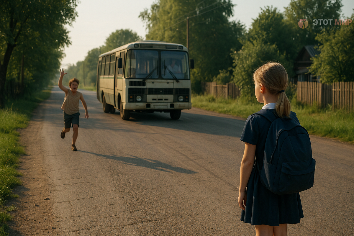 Катя стояла у калитки в синем сарафане с белым воротничком, волосы собраны в два тугих хвоста, рюкзак с карандашами, альбомом и любимой куклой. Она переминалась с ноги на ногу, разглядывая дорожную пыль, и считала секунды до прихода школьного автобуса.