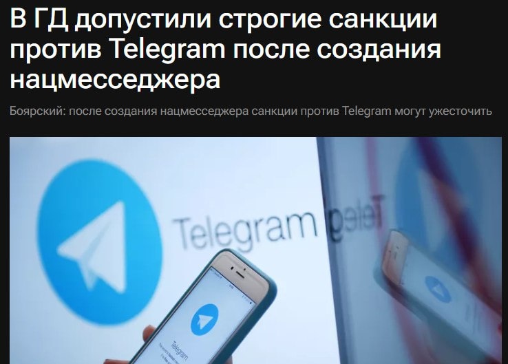 В Госдуме высказались о возможных серьёзных санкциях против Telegram после запуска национального мессенджера. Депутат Боярский отметил, что Telegram не выполняет требования по удалению запрещённого контента и хранению данных на территории России. Ранее ограничивать такие платформы, как Telegram и WhatsApp, было сложно из-за их широкой популярности. Несмотря на то что полного запрета не планируется, намёки на введение более строгих мер становятся всё более очевидными. Наш уютный канальчик 🤖 Анимация | СhatGPT-4 | Помощь с резюме