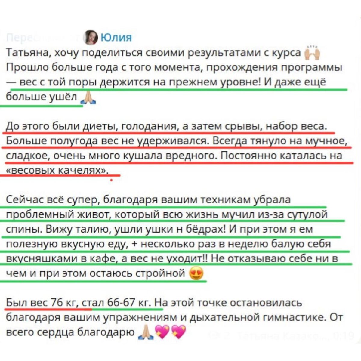 «…Прошло больше года с момента прохождения программы, а вес держится на прежнем уровне! И даже больше ушел