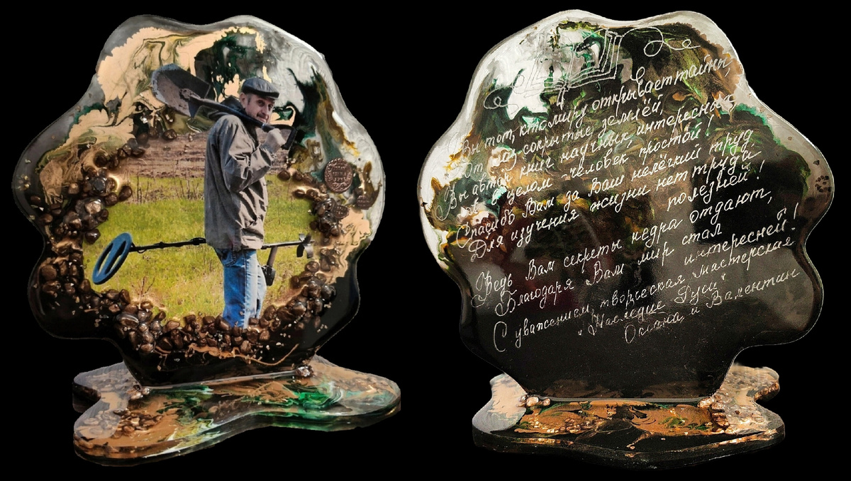 "С этой милой женщиной и её супругом я познакомился в прошлом году, когда они заехали ко мне и подарили приятную вещицу с моей старой фотографией. Оригинальным было использование старинных монеток, ради которых я и ходил "в поле".😊 Затем я увидел различные работы этой женщины и должен сказать, что появившиеся подражатели не могут передать тот налет историчности, что присутствует в работах Ксюши. Наверное потому, что сама она страстный поклонник... и очень хорошо чувствует материал. Впрочем судите сами." Так обо мне написал краевед и исследователь, писатель и поэт, реставратор и мастер художественного литья , самый скромный и бескорыстный, замечательный и добрый человек, которого Бог послал на моём жизненном пути и которого к сожалению забрал осенью того года... Когда уходят такие люди на душе остаётся пустота, недосказанность и печаль. Анатолий Николаевич всю свою жизнь посвятил любимому делу, тому, что волновало многие поколения, открыл тайны сакральной символики славян, напи