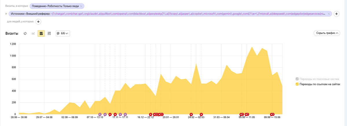 А вы знаете сколько пользователей приходит к вам с нейросетей? 👀 А мы знаем! ⌨️ Посмотрите, какой красивый рост трафика за год у одного клиента. Чтобы узнать, какая доля нейросетевого трафика приходится на ваши проекты, нужно зайти в Яндекс Метрику сайта, открыть раздел Источник - > Внешний реферрер и вставить регулярное выражение (ниже), чтобы в метрике отфильтровать остальные переходы и оставить только нужные нам. Регулярное выражение: ~(?:chatgpt.com|chat-gpt.org|claude.ai|quillbot.com|openai.com|blackbox.ai|perplexity(?:.ai)?|copy.ai|jasper.ai|copilot.microsoft.com|gemini.google.com|(?:\w+.)?mistral.ai|deepseek.com|edgepilot|edgeservices|nimble.ai|iask.ai|aitastic.app|bnngpt.com|writesonic.com|exa.ai|waldo|alice.yandex.ru) ✍️ колонка Света | #Seo #Продвижениесайтов #Нейросети - - - SLT | Квадрат Свет(а) | SEO формула – канал для предпринимателей, маркетологов и seo-специалистов.