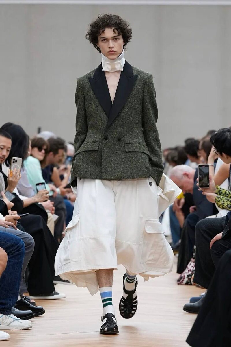 Я тебя породил, я тебя и убью: Джонатан Андерсон велел коллегам завязывать с короткими шортами, которые сам же и ввел несколько лет назад. Вместо них – шорты New look с фалдами плюс жакет Bar с подбитыми бедрами. Андерсон всегда играл формами, и в своей первой коллекции Dior лишь размялся. Задача была наметить, дать понять, что он умеет. От кроя до стилистических трюков – скажем, повесить галстук обратной стороной. Или завязать его в невиданный узел. Андерсон нашел «точку входа» для новых – и не самых денежных – покупателей. Шейный платок! Бархатный ли, хлопковый, но безупречно выглядящий что с камзолом, что с футболкой. Чистый Бо Браммел современности: за тем тоже оставались горы недостаточно хорошо завязанных, накрахмаленных платков. Глядя на гардеробное разноголосие, мне почудилось, что дизайнер собрался подружить даже народы Ближнего Востока. В коллекции были отсылки и к джалабии (мужскому арабскому платью), и к цициту – переплетенным нитям с кисточками в иудаизме. Dior Men Spr